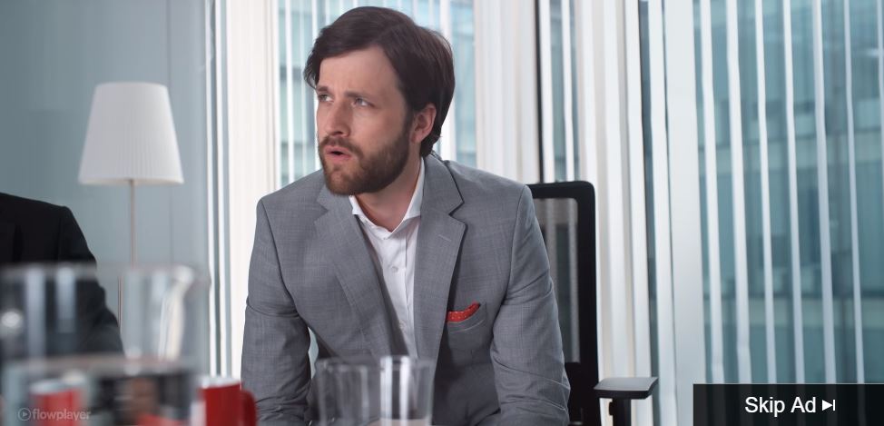 Ora lo vedremo nei prossimi giorni in un nuovo spot dove deve presentare un progetto, un modello, durante una riunione, che è coperto da un telo. Ovviamente deve scoprirlo ed è così lentissimo che come al solito si fa passare da un collega...