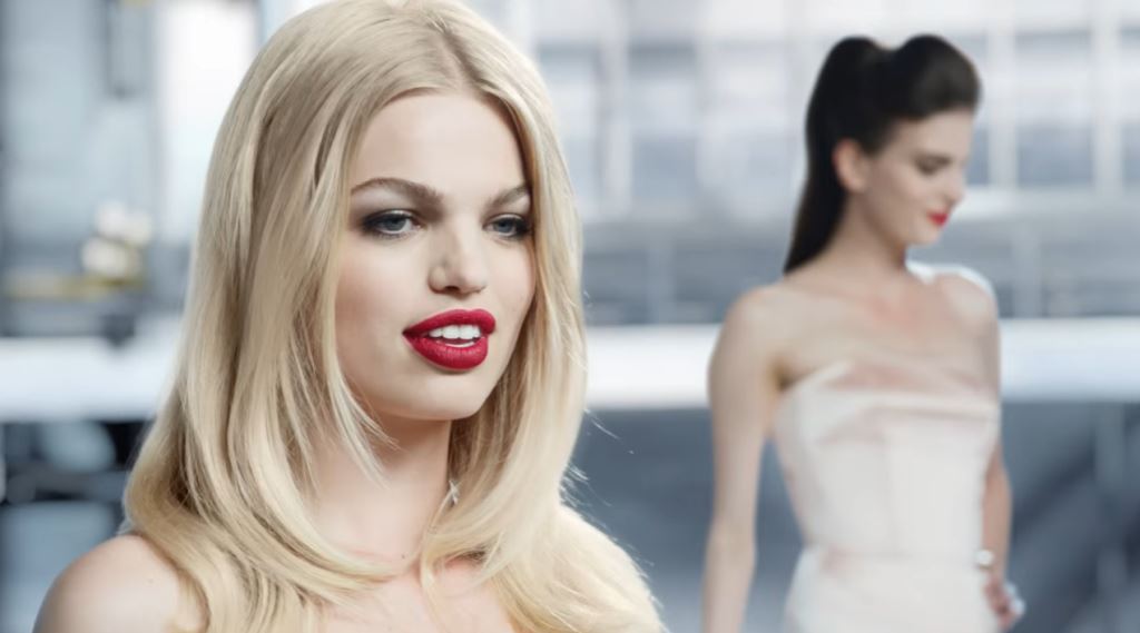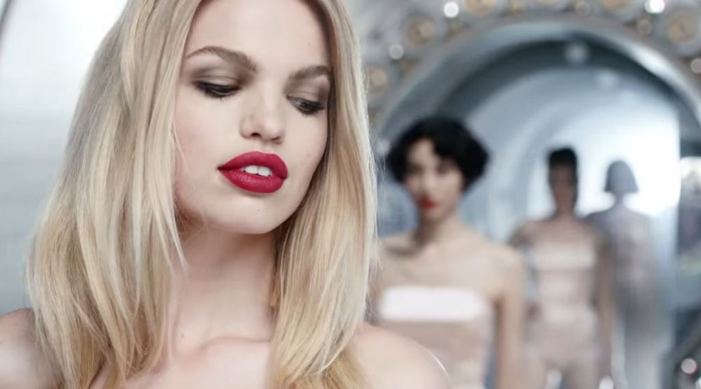 Modella bionda con rossetto colore rosso acceso spot Jean Paul Gaultier 2016