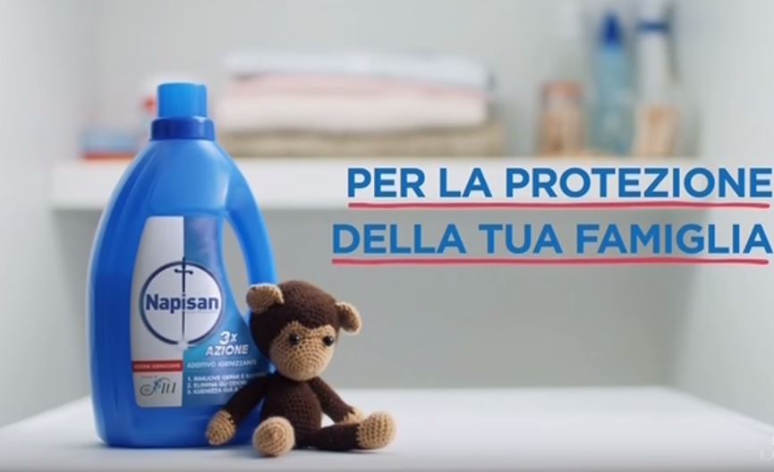 Nella pubblicità "Napisan igienizzante tripla azione" vediamo una bambina giocare con una scimmietta di peluche appena lavata dalla mamma con Napisan igienizzante tripla azione.